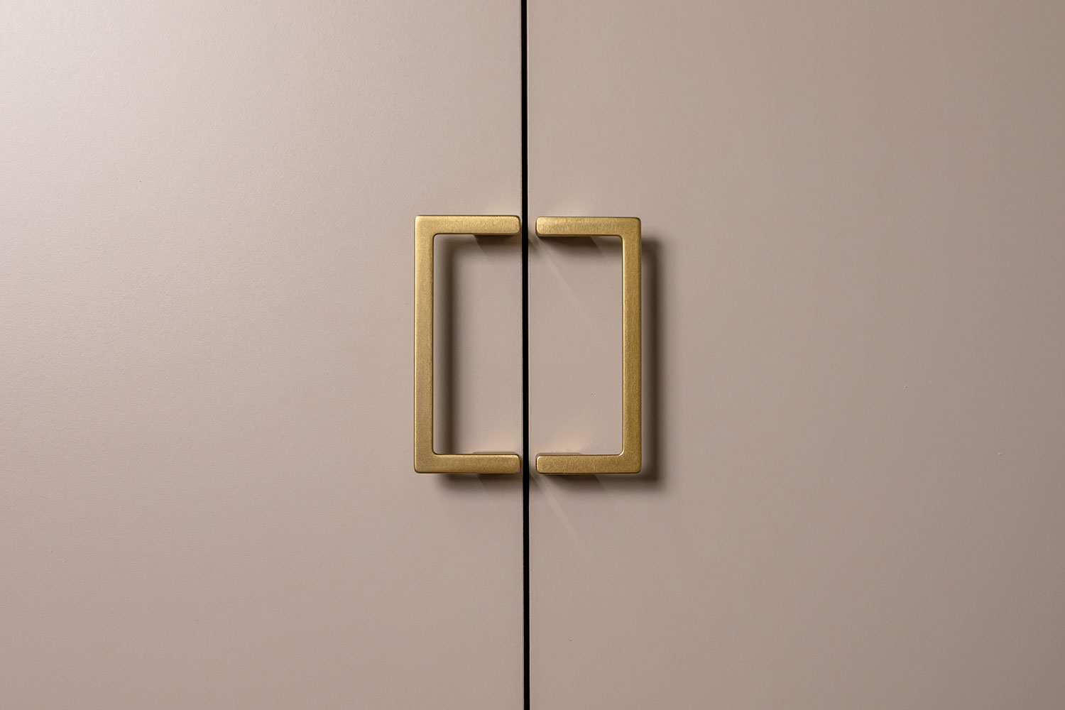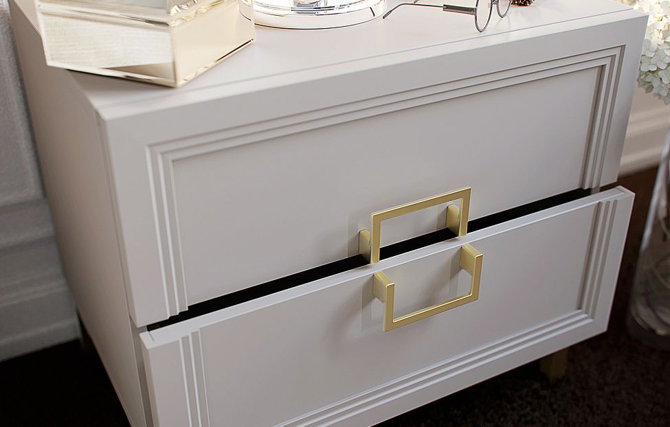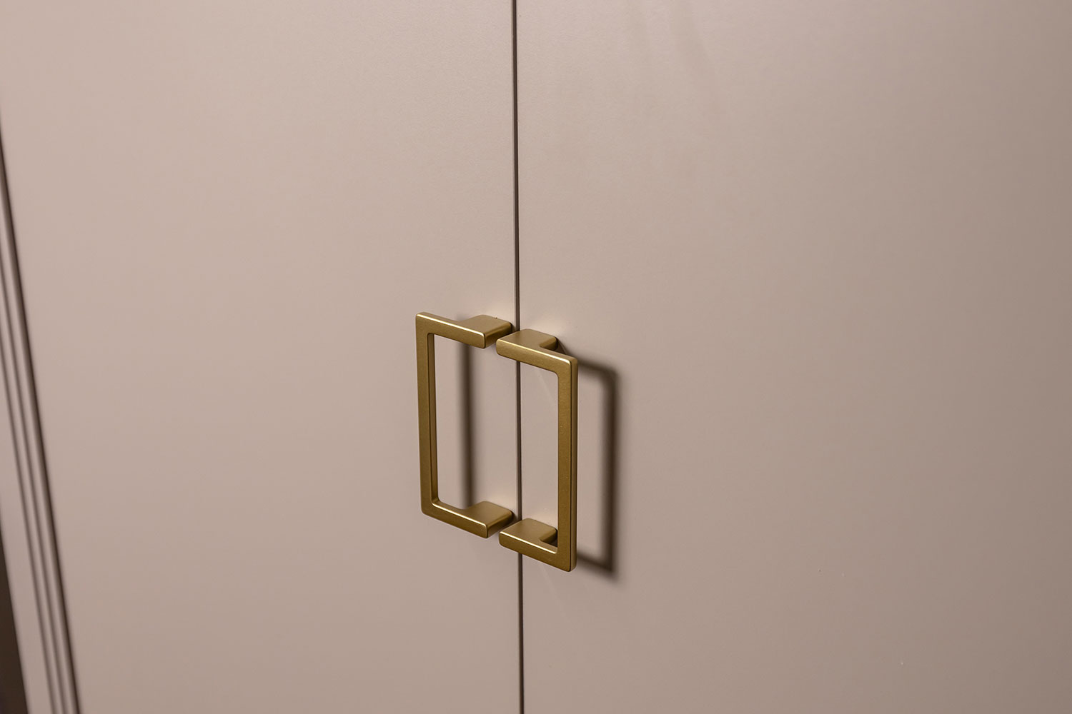 - Основу дизайна составляет геометрический символ — квадрат. Это видно по золотым матовым ручкам на тумбах и шкафах;