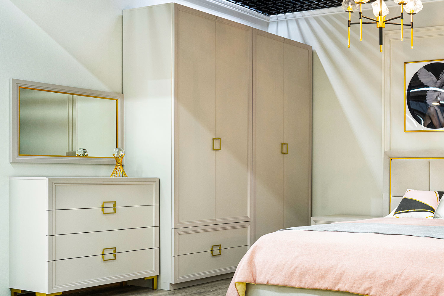 - Спальня Дольче выполнена в стиле эклектики, а также соединяет в себе стиль ар-деко в современном прочтении и минимализм. К строгим формам и безупречной геометрии добавлена гладкая текстура кашемира, позволяющая смягчить декор и подарить коллекции шлейф тонкой роскоши с золотыми вставками;