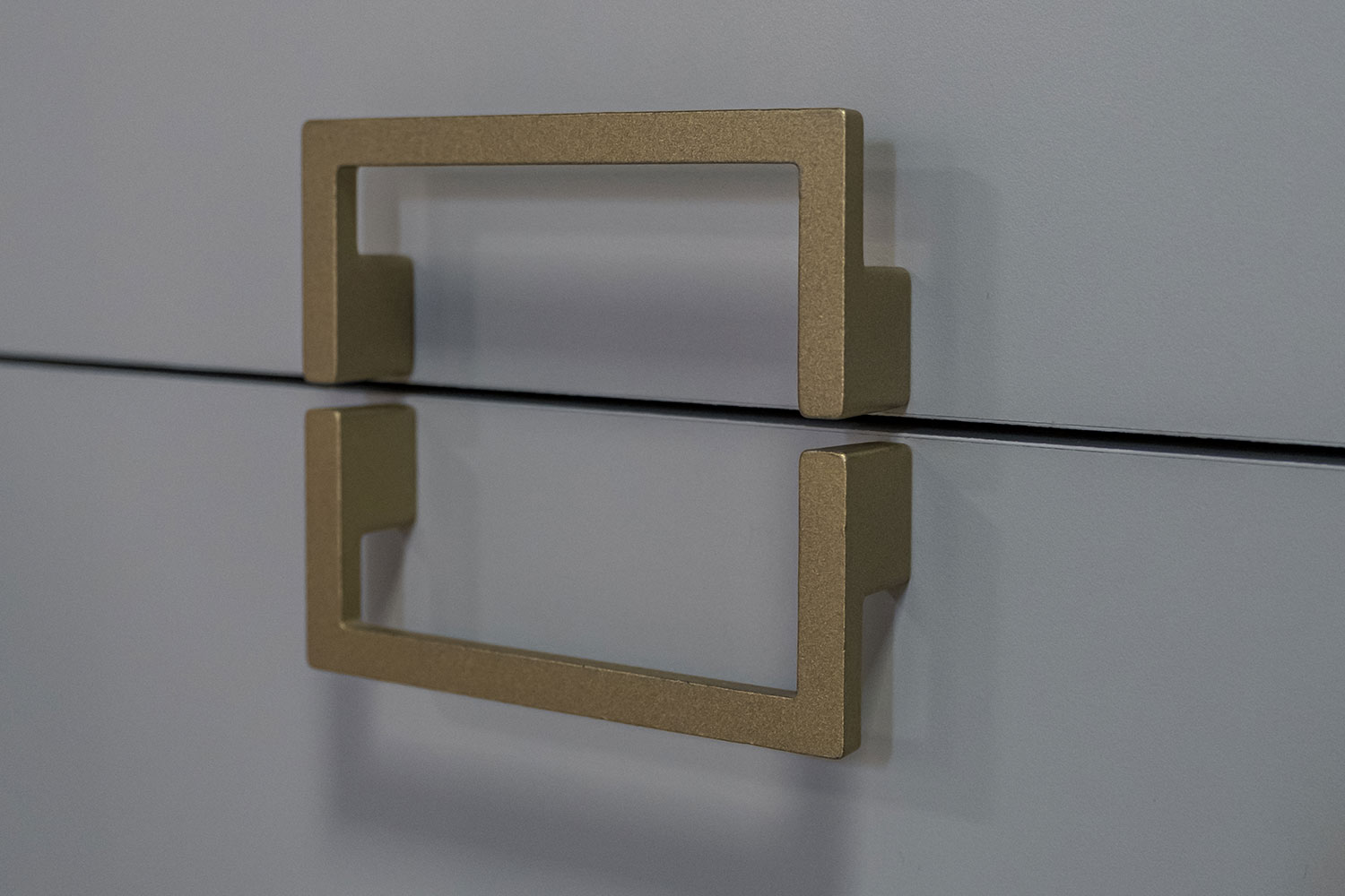 - Основу дизайна составляет геометрический символ — квадрат. Это видно по золотым матовым ручкам на тумбах;