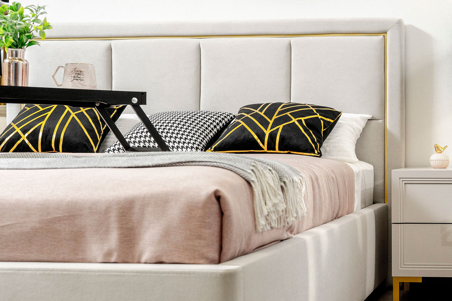 - Декоративная акцентная рама в изголовье кровати повторяет форму ручек.