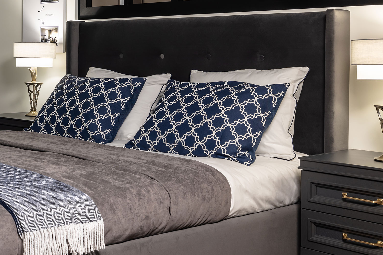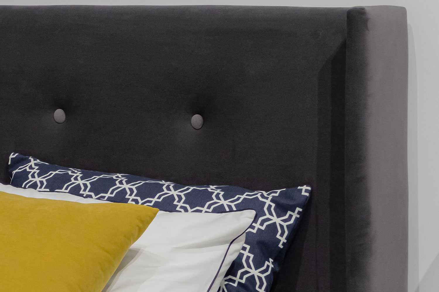 - Детали кровати обтянуты тканью Avelina (9852), изголовье декорировано пуговицами;