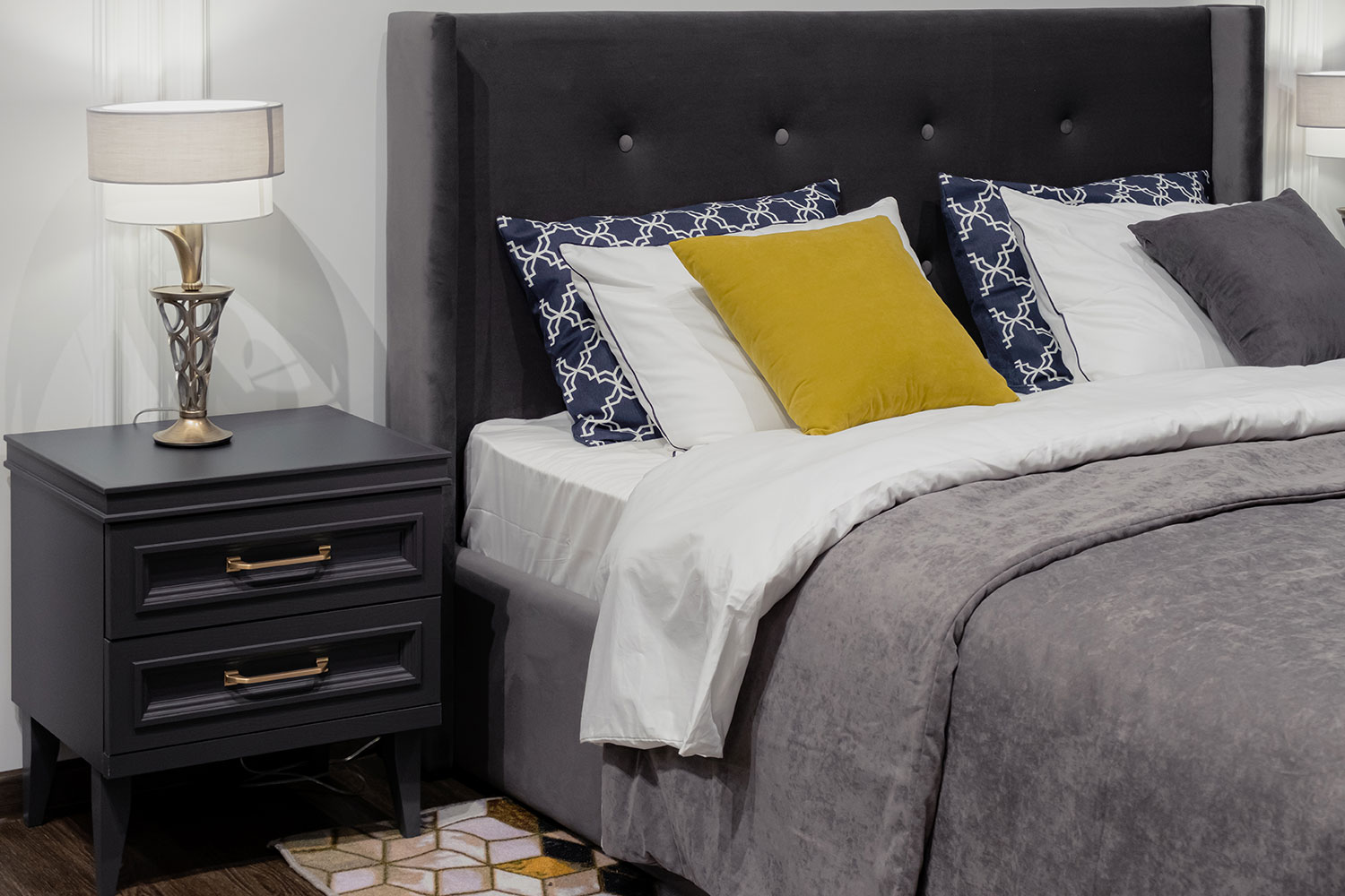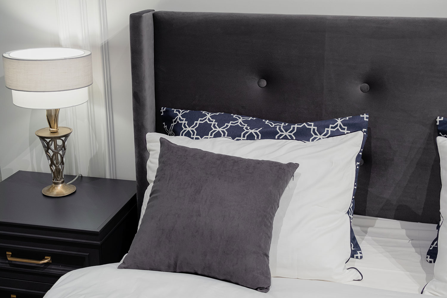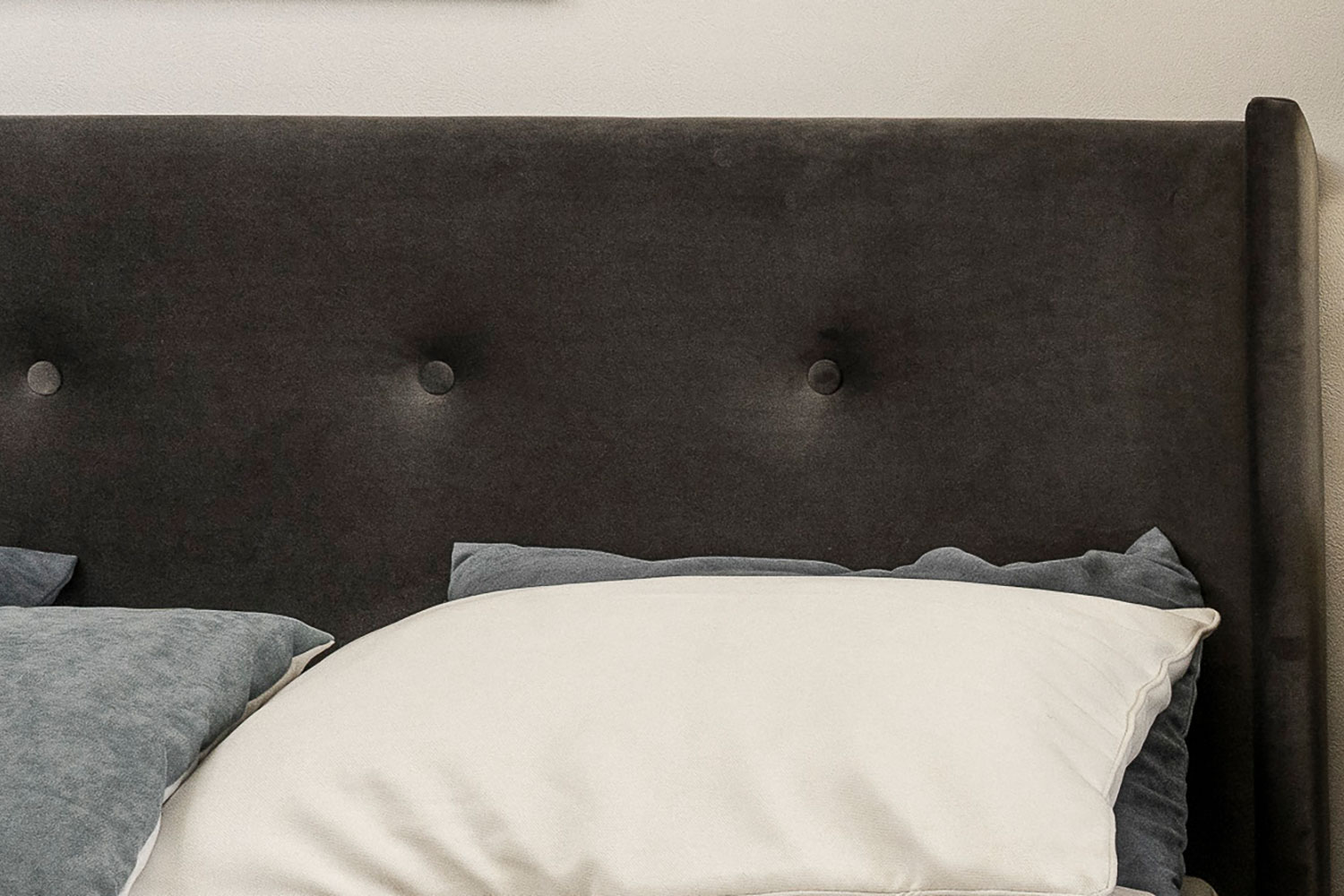 - Детали кровати обтянуты тканью Avelina (9852), изголовье декорировано пуговицами;