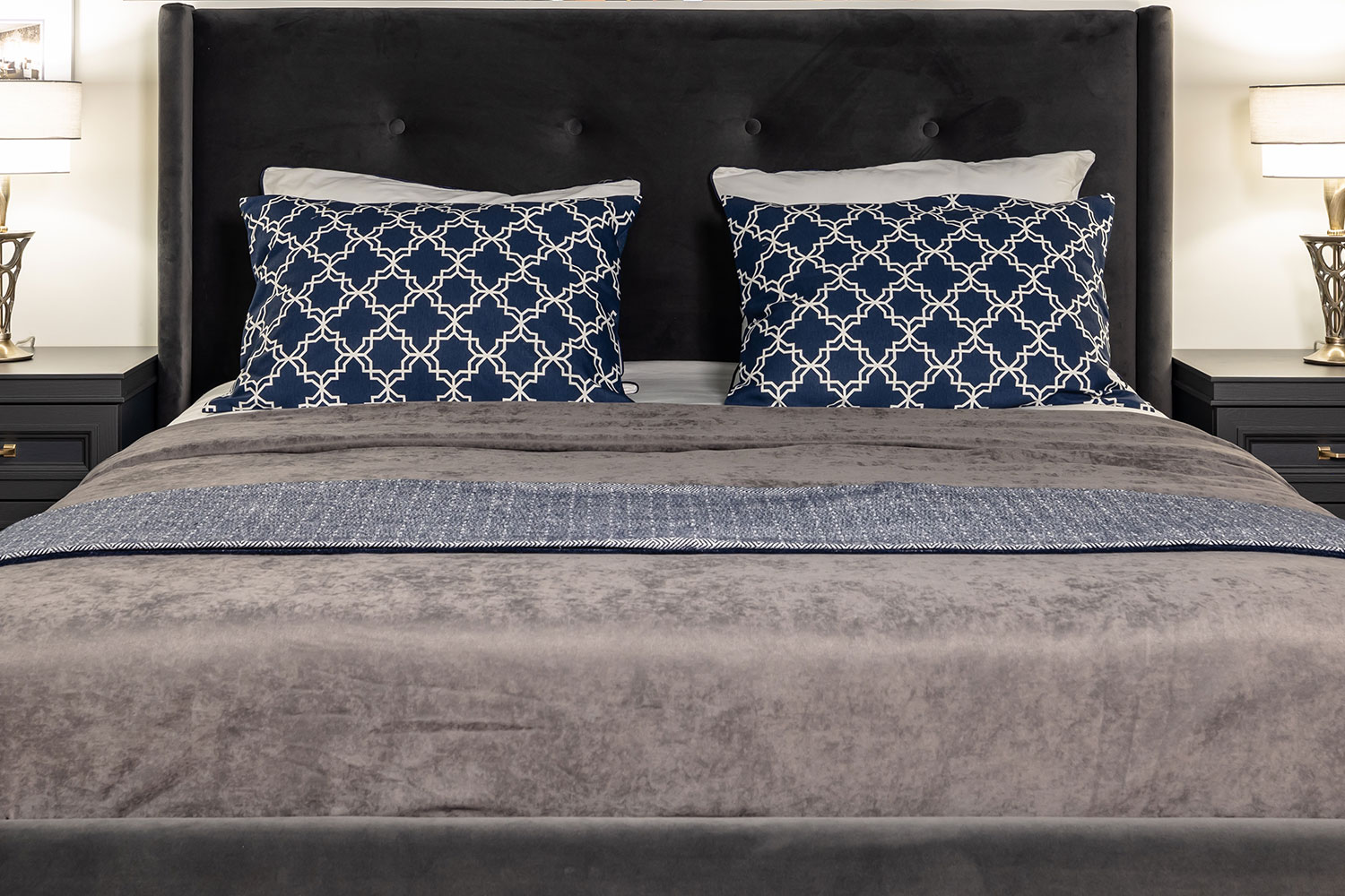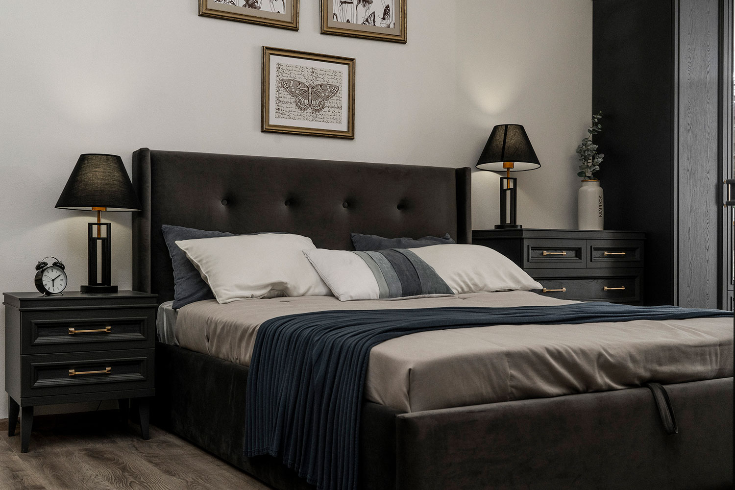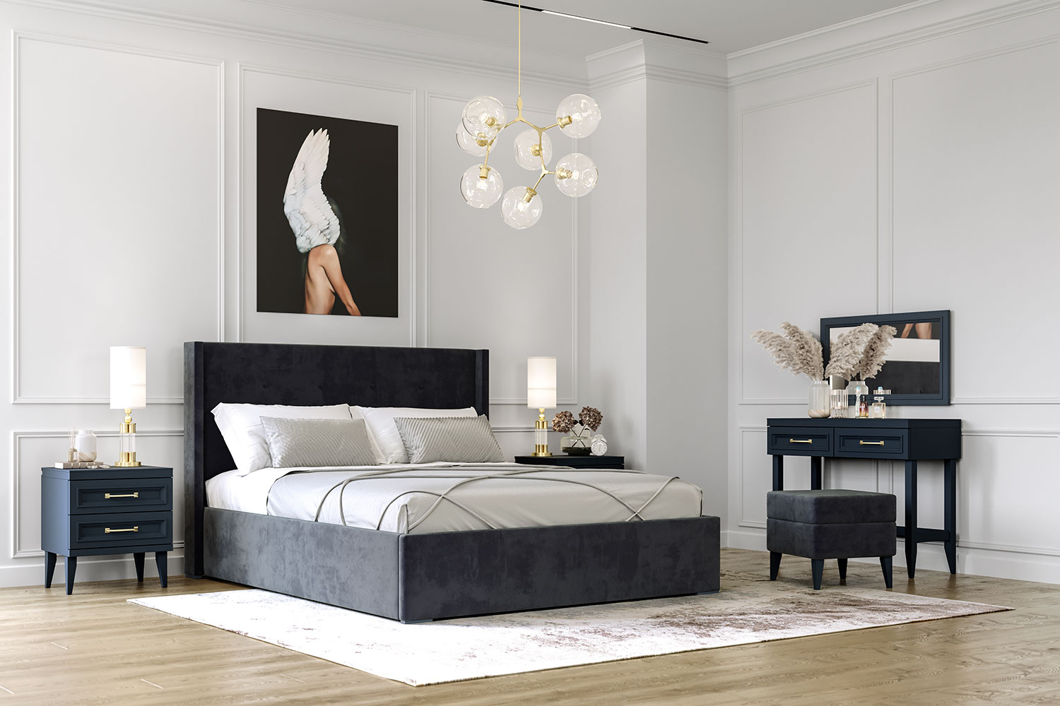 - Детали кровати обтянуты тканью Avelina (9852), изголовье декорировано пуговицами;