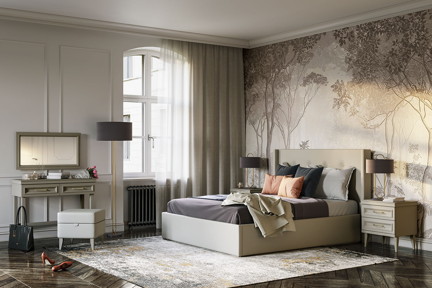 - двуспальная кровать с мягким изголовьем, отделанным микровелюром с элементами утяжки и пуговицами;