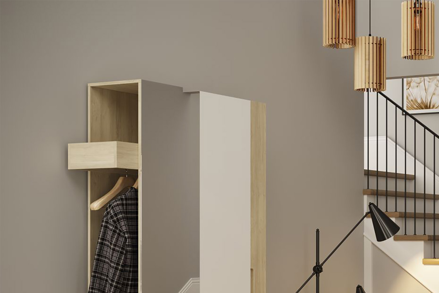 Современная и оригинальная прихожая займет почетное место в доме ценителей стиля сканди, лофт или минимализм. Светлые древесные текстуры разбавлены белыми матовыми фасадами, скрытые эргономичные ручки подчеркивают лаконичность дизайна. Необычные формы соседствуют с гладкими поверхностями.