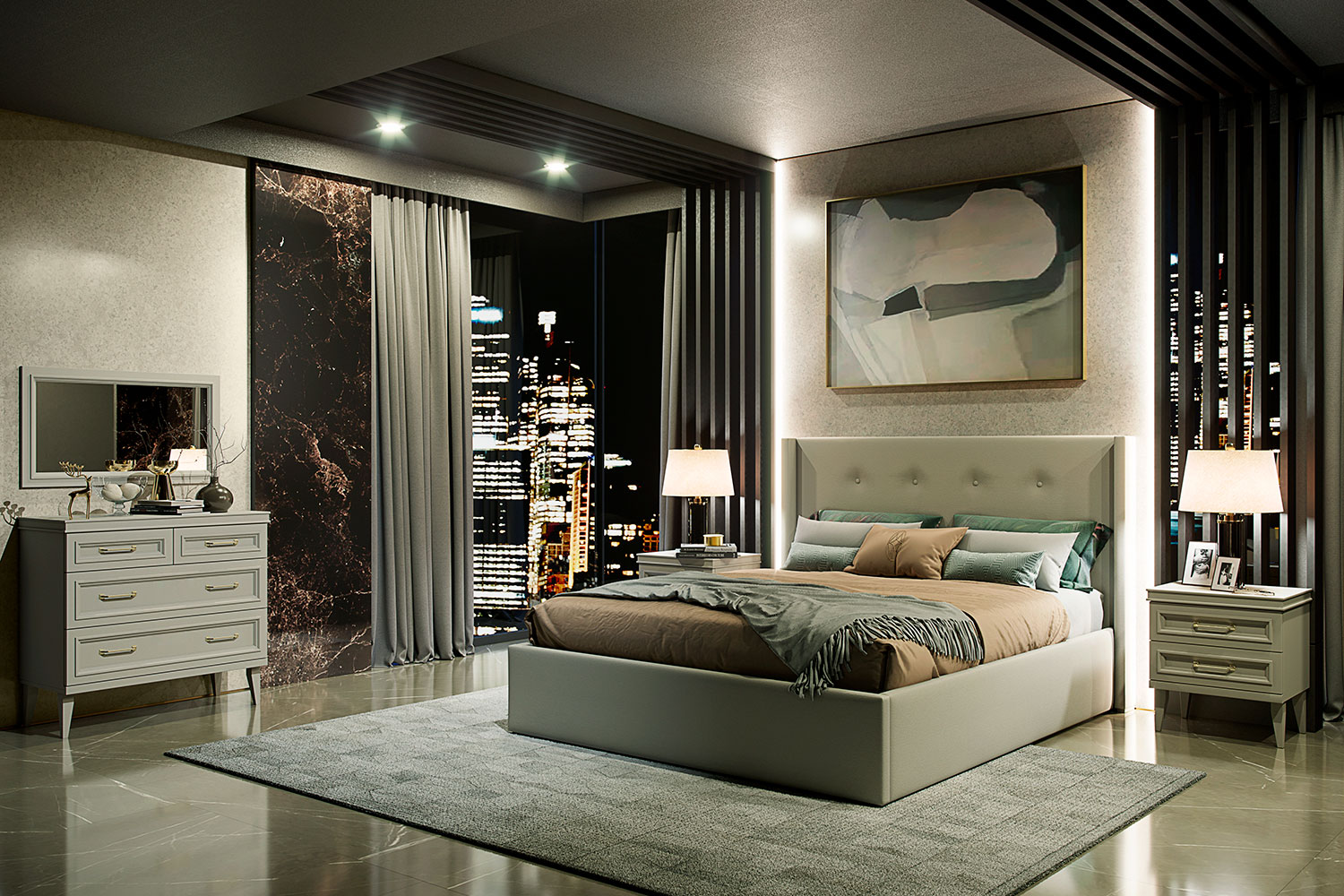 - Детали кровати обтянуты тканью Avelina (9534), изголовье декорировано пуговицами;