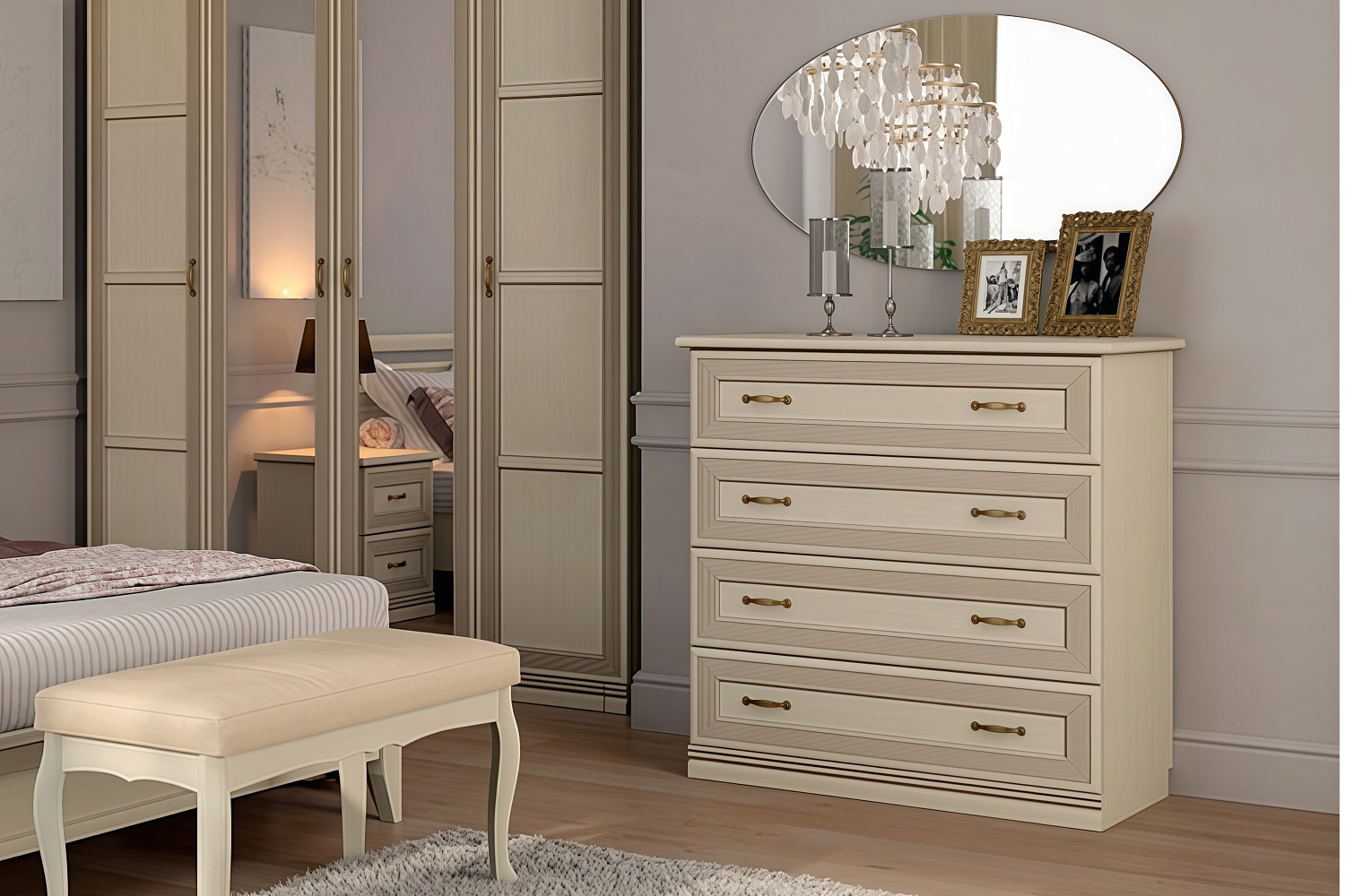 Чтобы сделать интерьер более завершенным, вы можете дополнительно приобрести металлические аксессуары в бронзовых оттенках и абстрактные постеры с яркими акцентами. Для большего удобства композицию можно завершить мягким пуфом или банкеткой в тон мебели. Конечно же, не забудьте про туалетный столик, который сделает утренние и вечерние ритуалы еще приятнее.