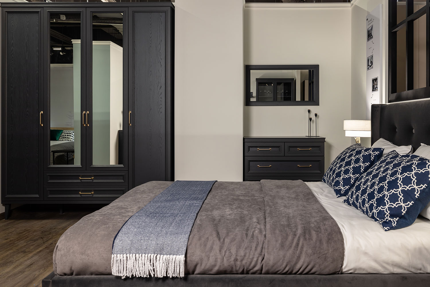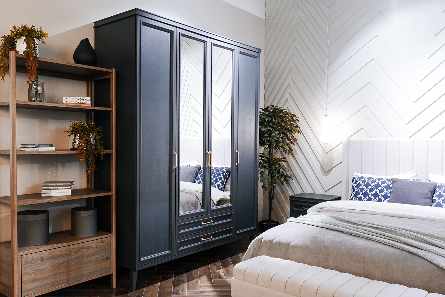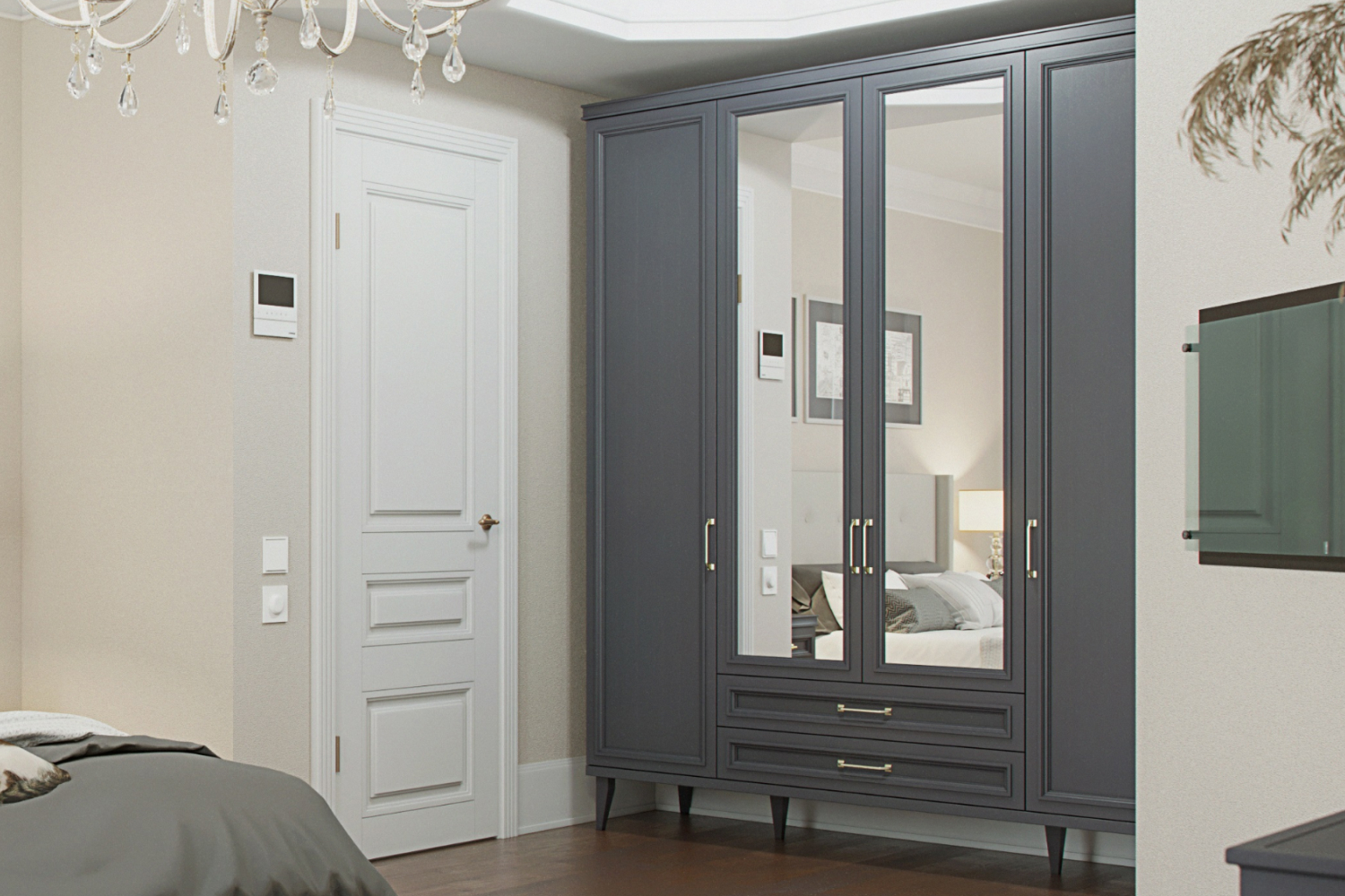 - Шкаф 4-створчатый с центральными зеркальными фасадами, 2 боковыми глухими фасадами и 2 выдвижными ящиками;