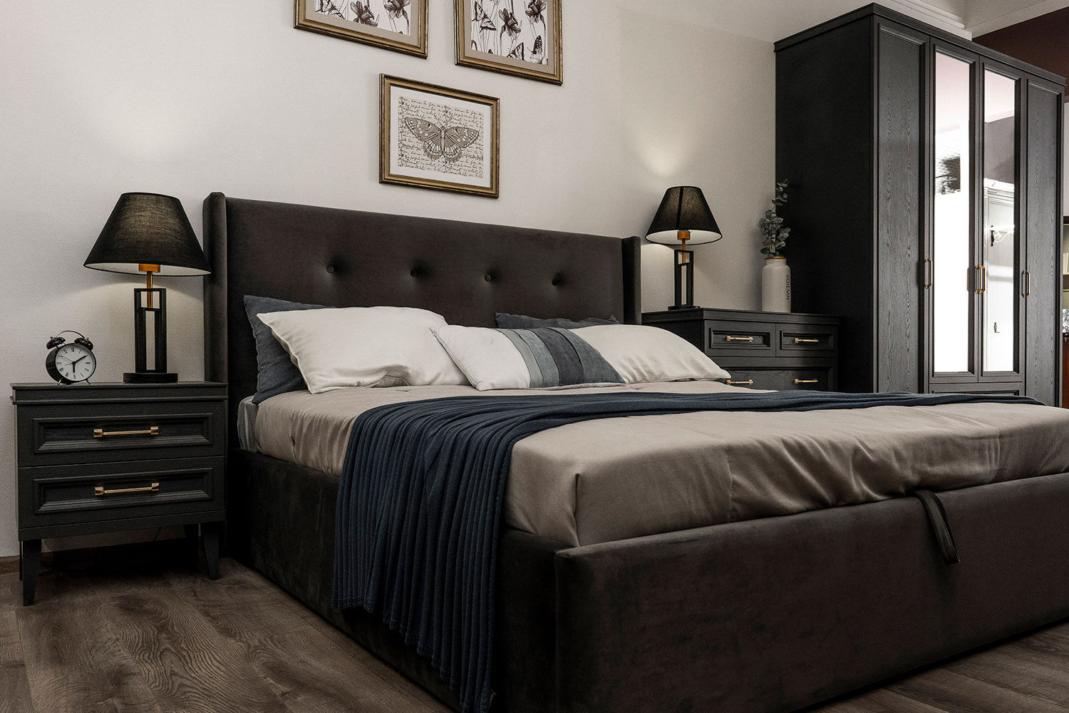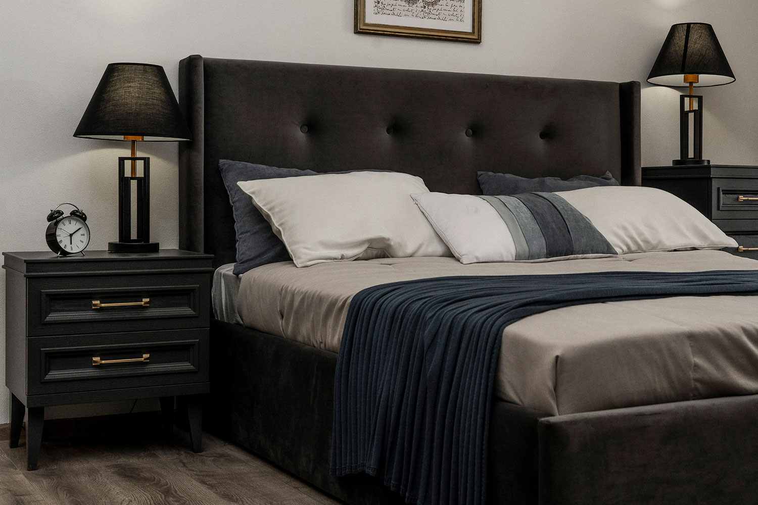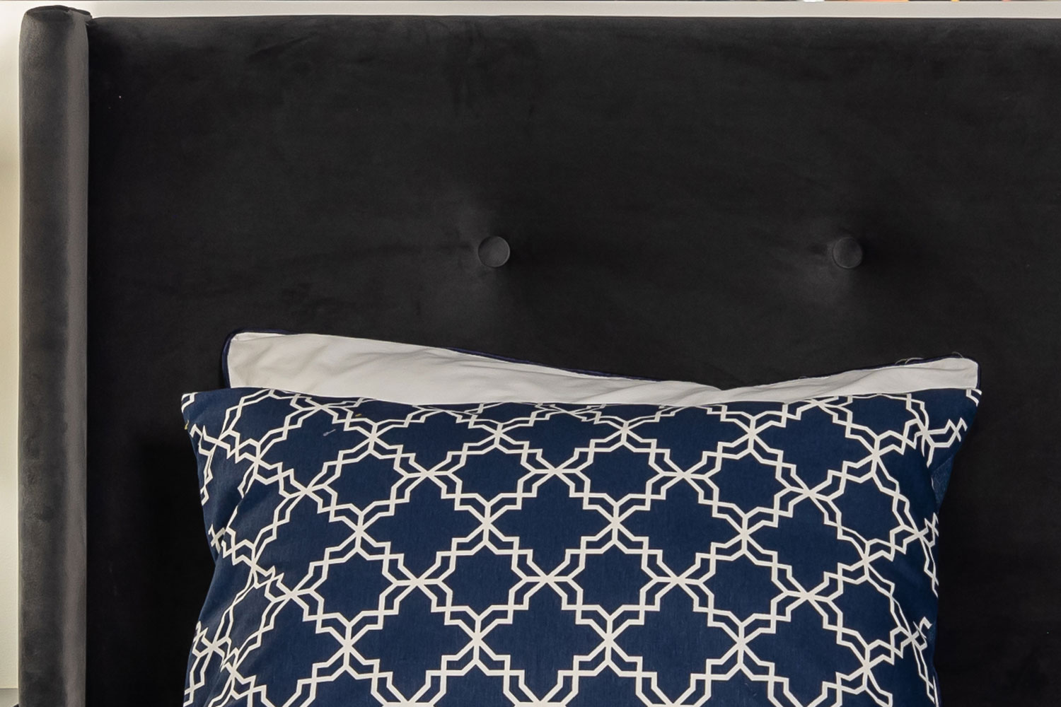 - Детали кровати обтянуты тканью Avelina (9852), изголовье декорировано пуговицами;