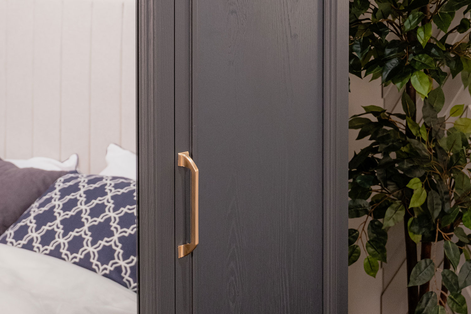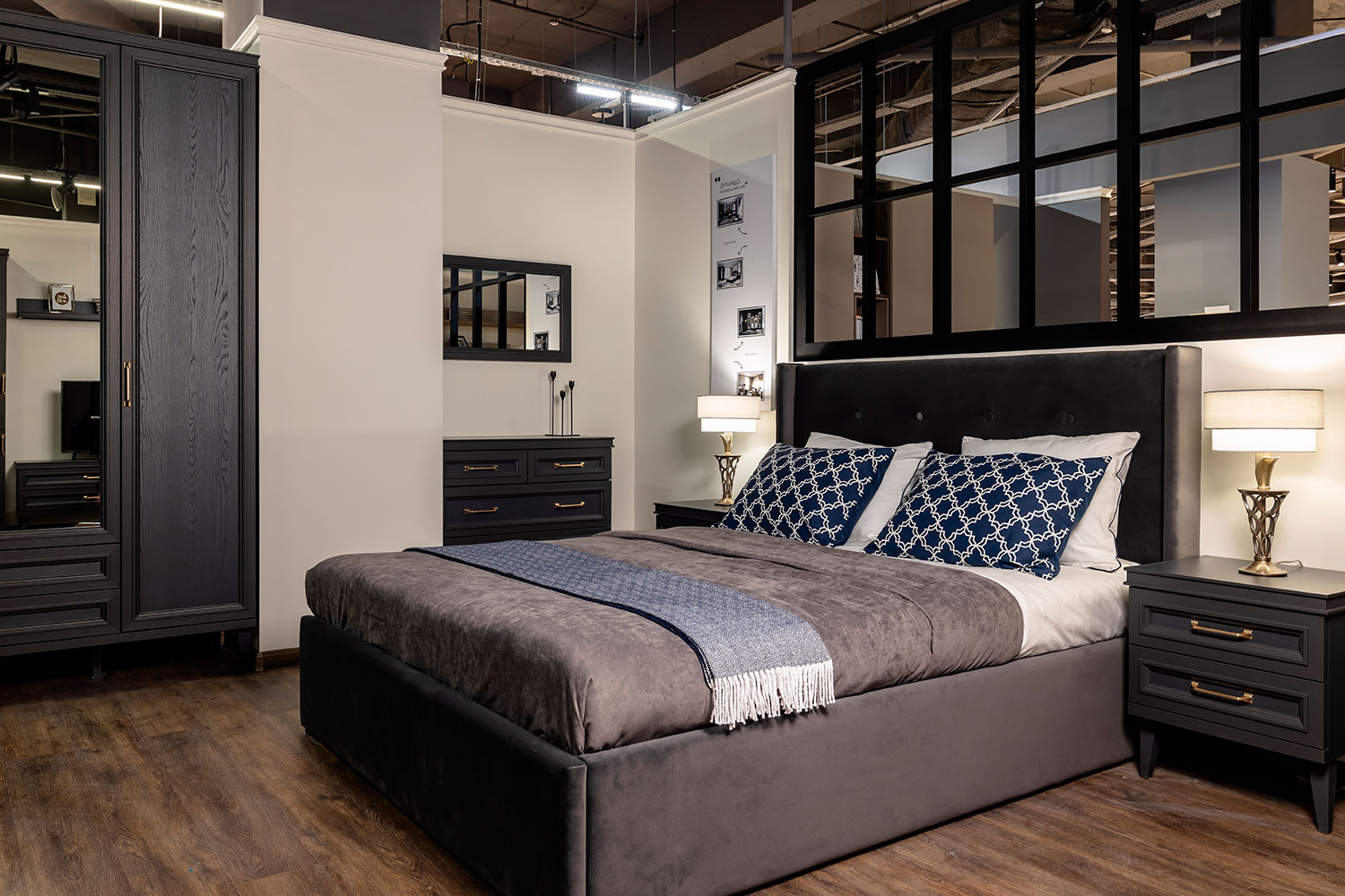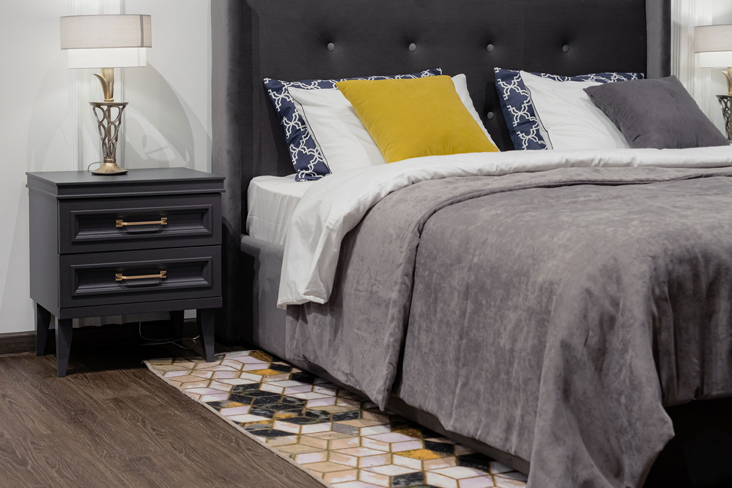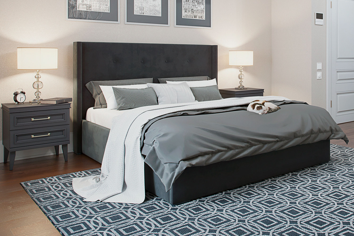 - Детали кровати обтянуты тканью Avelina (9852), изголовье декорировано пуговицами;