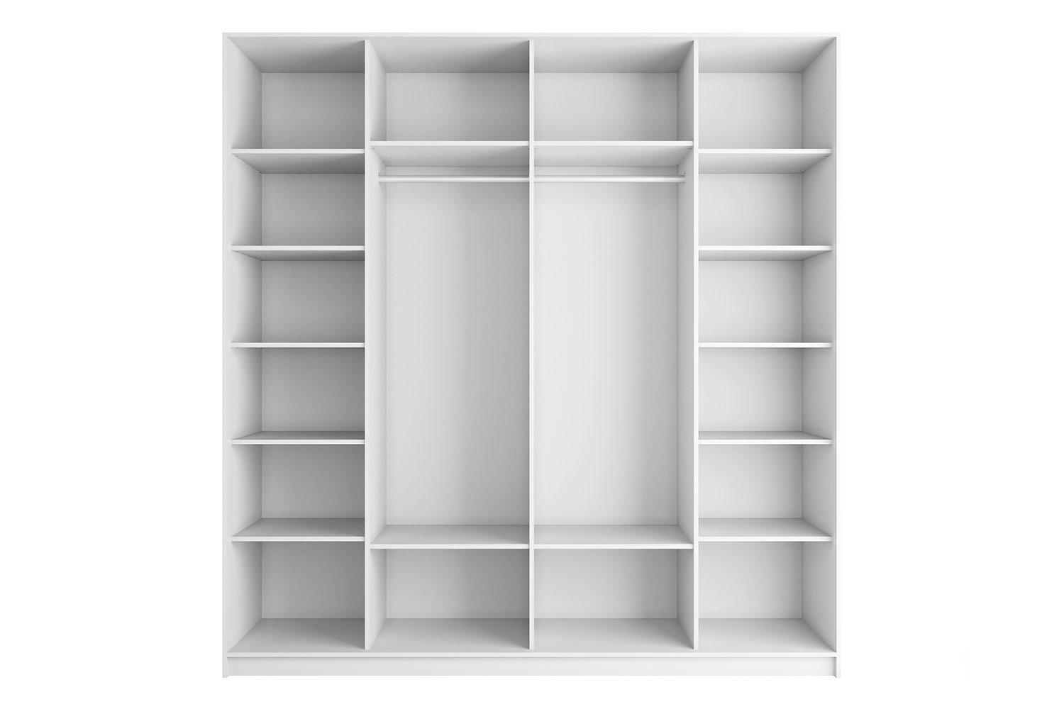 - Внутреннее пространство разделено на 4 части — центральные секции содержат штангу для одежды и по 2 ниши сверху и снизу, крайние секции укомплектованы пятью полками в каждой;