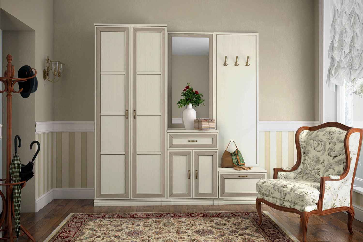 - Адажио — образец сдержанности и изящества, стиля и элегантности. Мебель из коллекции подойдет не только к классическим интерьерам, но и к прихожим в стилях фьюжн, контемпорари и эклектика;