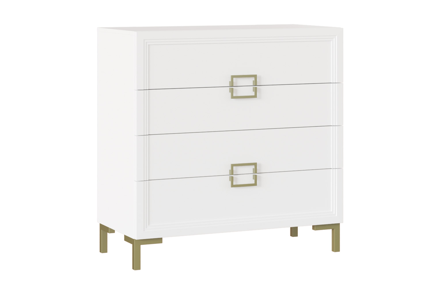 Элегантный лаконичный комод с четкими прямыми линиями будет превосходно смотреться в спальне, гостиной, прихожей, оформленной в стиле ар-деко или минимализм. Четыре выдвижных ящика визуально объединены рисунком квадратных ручек. Изящный оттенок «белый премиум», фурнитура и опоры «под золото» только усиливают эффектность мебели.