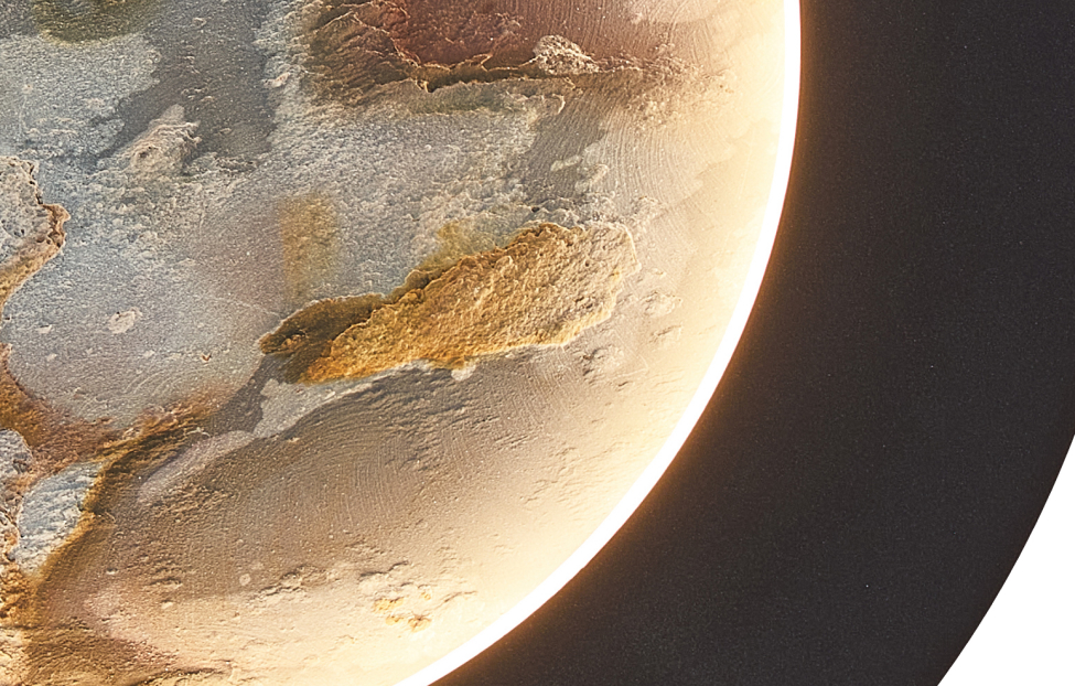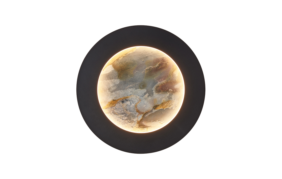 Коллекция Lago расширяет границы визуального восприятия декоративного материла LAGO натуральный песчаник, умелое использование которого сделает любой интерьер авторским. Настенные светильники оснащены двумя источниками света. Свет от LED-ленты, обрамляющий периметр декоративного диска на внешней стороне бра, выделяет фактуру камня и мягко освещает пространство вокруг. Второй источник света направлен в сторону стены и подсвечивает заднюю поверхность светильника, создавая ощущение, как будто он парит в воздухе в лучах света. Металлический каркас в матовом черном цвете, белый рассеивать из акрила, лента LED по периметру декоративного диска из натурального камня "зеленый песчаник" и на задней поверхности.