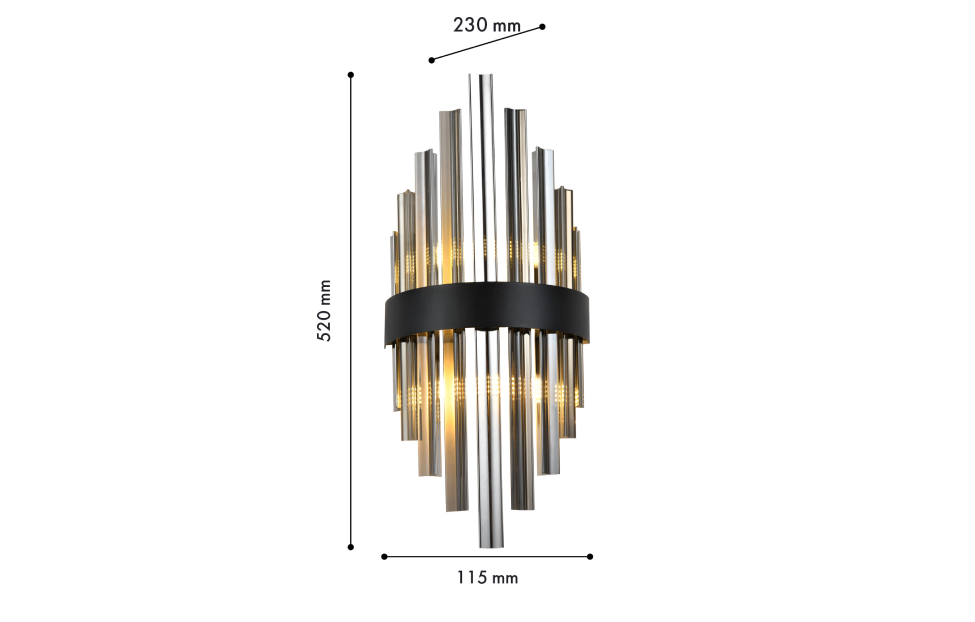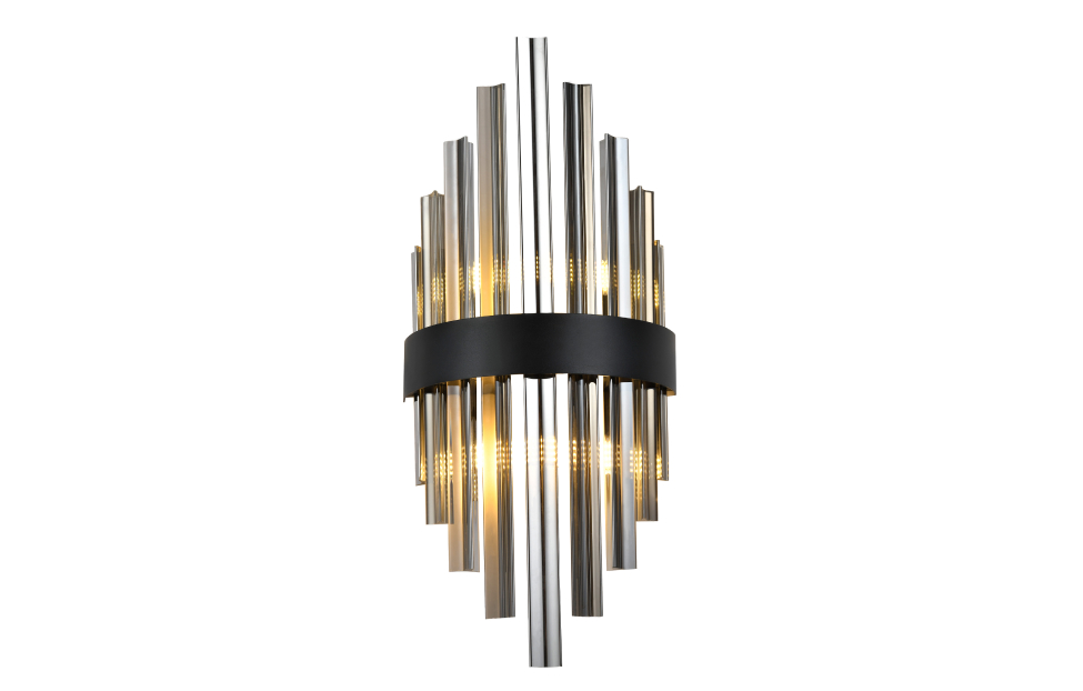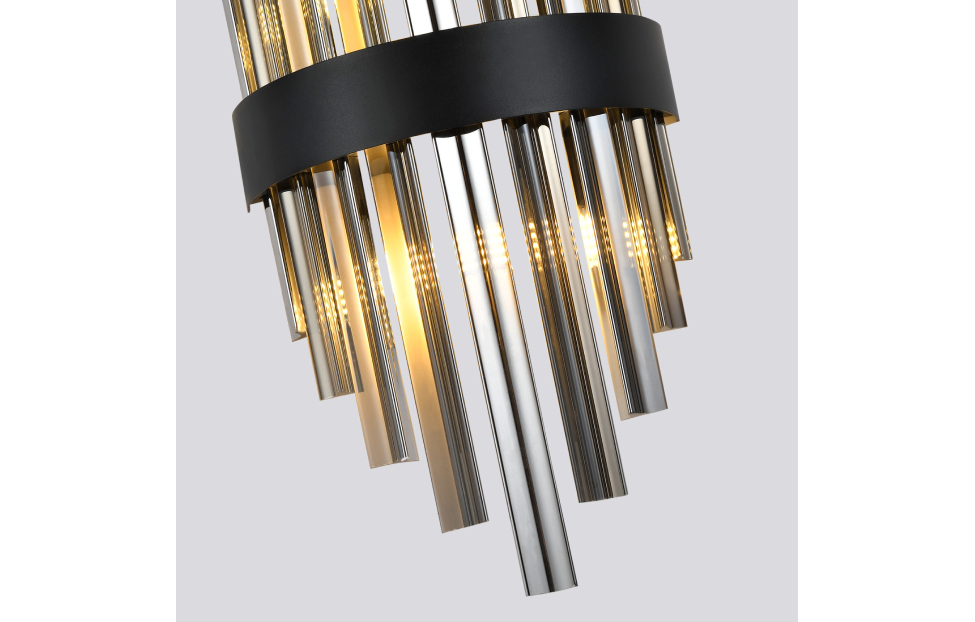 Металлический каркас в черном цвете, дымчато-серый хрусталь, встроенная лента LED.