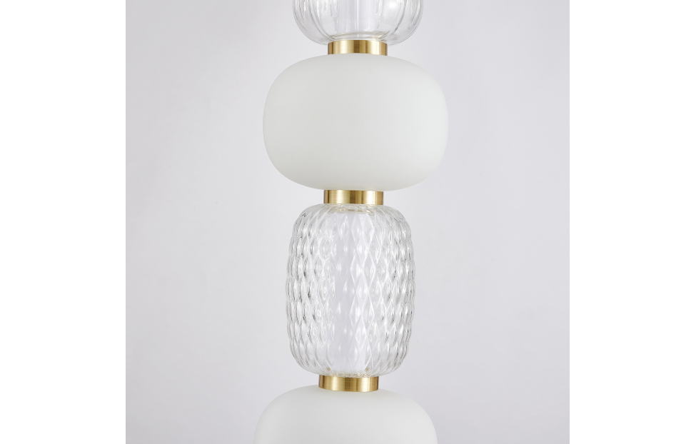 Чередование стеклянных плафонов разной формы, цвета и рисунка, а также цветовое решение каркаса в золоте создает насыщенный сложный и дорогой образ. Металлический каркас цвета золота, плафоны в виде бусин разнообразных форм из выдувного стекла двух видов - прозрачного и цвета опала.