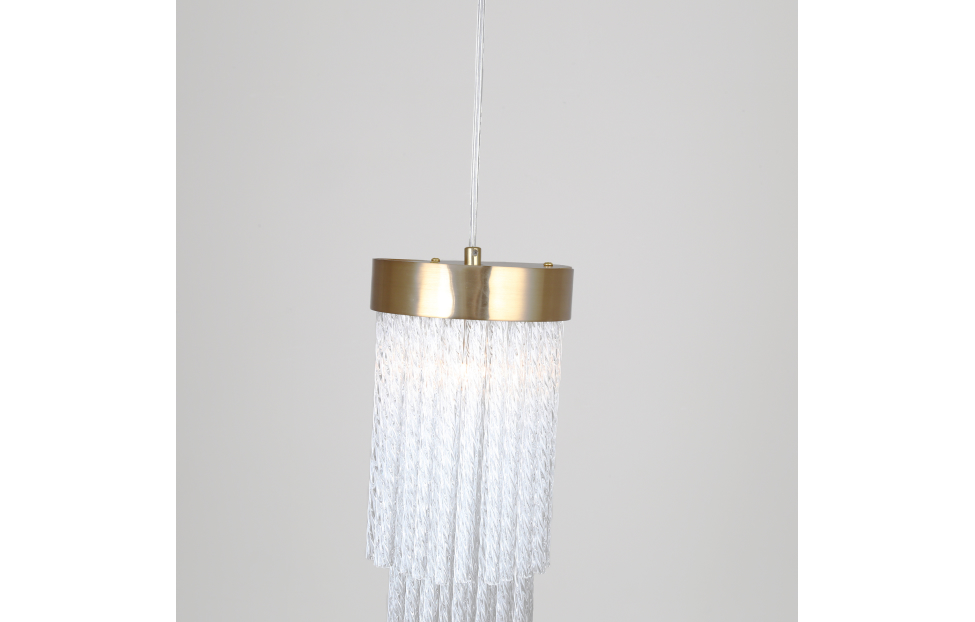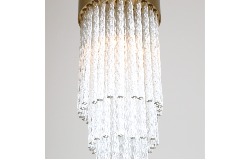 Коллекция Bellinda выполнена в стиле американской классики. Каскадная конструкция состоит из закрученных вокруг своей оси стеклянных трубочек. Этот декор скрывает лампы и мягко пропускает свет. Цвет латуни придает подвесу изысканный вид.
