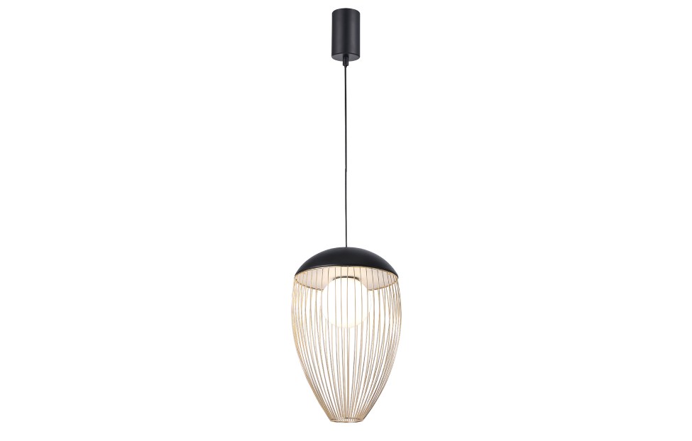 Коллекция Core — это гармоничное сочетание прочности металла и нежности стеклянных плафонов. Стеклянный выдувной плафон заключен в проволочный каркас из тонких, спаянных между собой металлических трубочек, создавая эффект золотой клетки, защищающей светящийся шар. Подвесная лампа диаметром 28 см с регулируемой высотой шнура, стеклянный выдувной плафон заключен в проволочный каркас из тонких, спаянных между собой металлических трубочек, каркас в черном цвете с золотым, модуль LED.