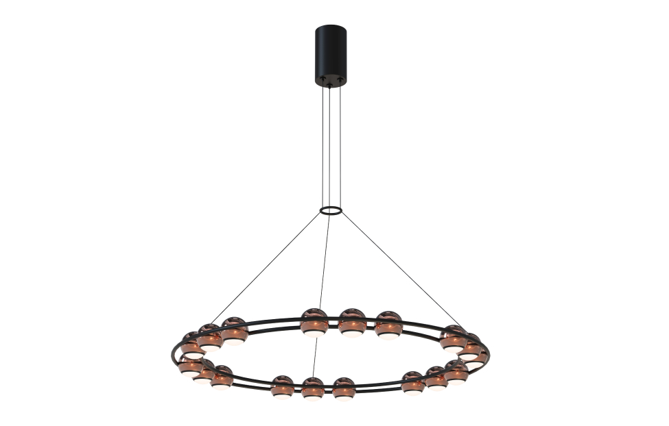 Каркас светильников Sturm состоит из двух металлических трубок черного цвета, между которыми расположены чередующиеся группы софитов в сферических плафонах. Особенность люстр коллекции Sturm — возможность изменять угол наклона каркаса, меняя длину провода. Это позволяет настраивать конфигурацию и расположение светильника в соответствии с особенностями интерьера, создавая различные визуальные эффекты.