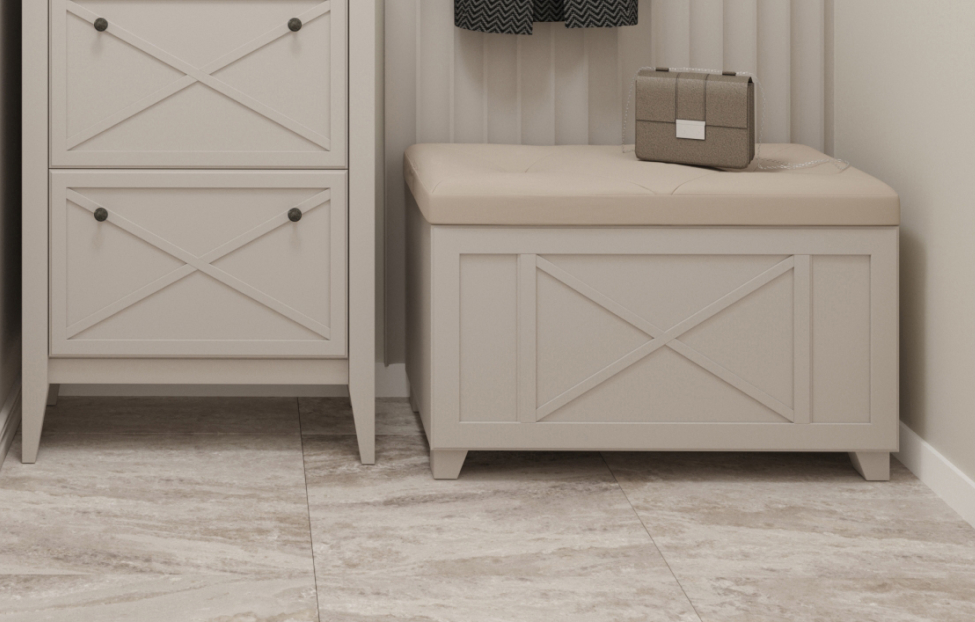 Изящная банкетка со стильными скошенными опорами дополнит не только классический интерьер, но и любую современную обстановку. Мягкий оттенок «кашемир серый» позволяет создать особую атмосферу домашнего уюта. Общий стиль подчеркивает декоративный элемент фахверк.