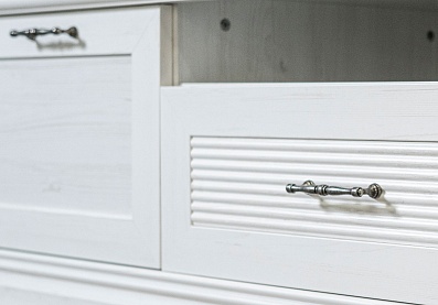 Меблировка выполнена из ламинированной ДСП и МДФ-профиля. Откидная крышка имеет мягкую отделку сверху, а ее петли оснащены демпфером для плавного и бесшумного закрывания. Все кромки облицованы качественным материалом.