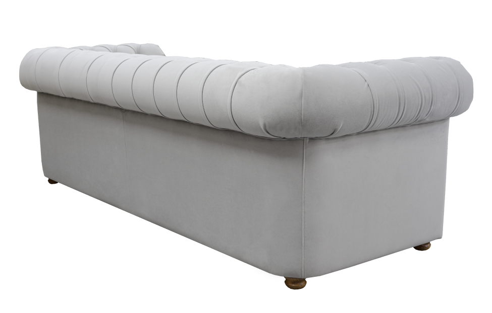 Мебель в классическом английском стиле привнесет в интерьер солидность и респектабельность. Роскошная обивка из черной искусственной кожи идеально сочетается со знаменитым традиционным дизайном. Ромбовидная каретная стяжка «капитоне» подчеркивает гладкую фактуру отделочного материала. Углы ромбов декорированы пуговицами, обтянутыми в тон основной ткани. Фронтальная часть боковин украшена эффектным гвоздевым молдингом. Низкая спинка находится на одном уровне с изогнутыми в форме свитков подлокотниками, создавая узнаваемый силуэт.