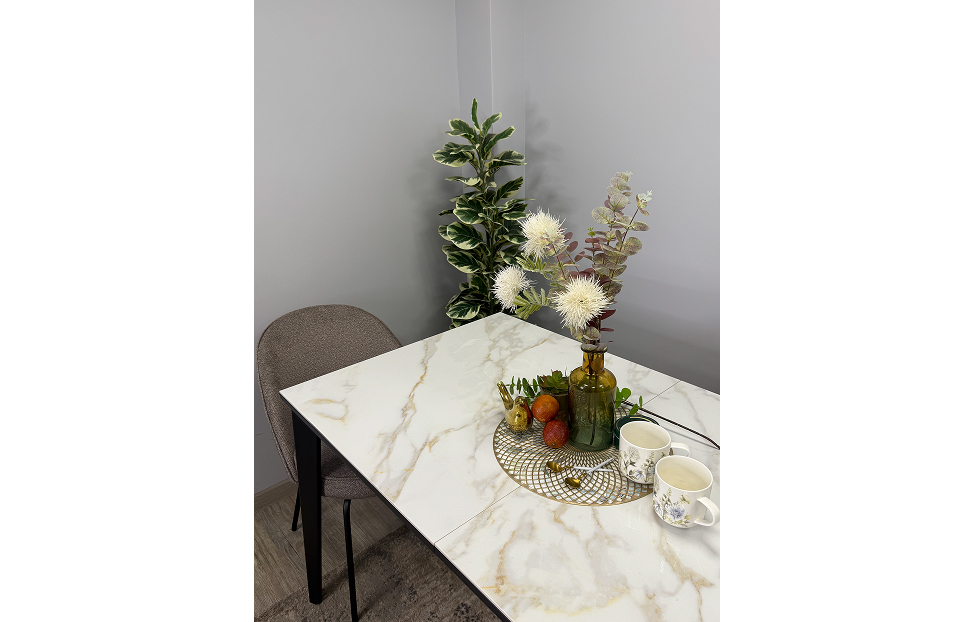 Керамика - наилучший и самый дорогой материал для обеденного стола. Она не портится от влаги, выдерживает температуру до 1000°С. Плотность керамики выше плотности металла и на ней не останутся следы от столовых приборов. Кроме того, это 100% натуральный материал в отличие от разного вида пластиков, также керамика обладает гипоаллергенными свойствами, и можно спокойно хранить продукты на столешнице.
