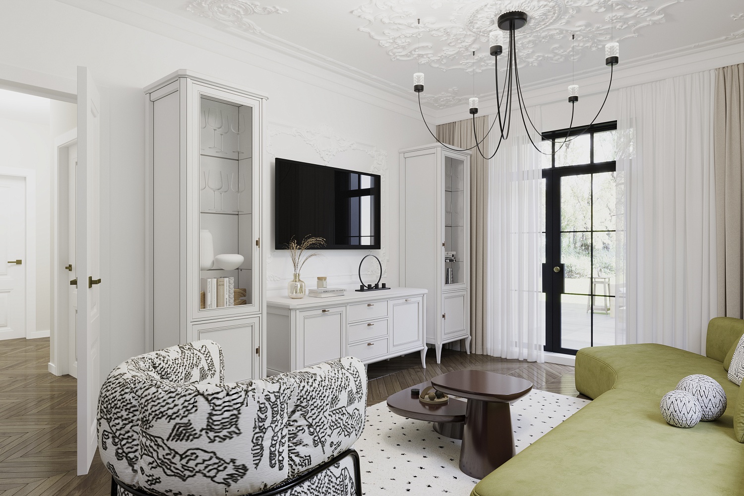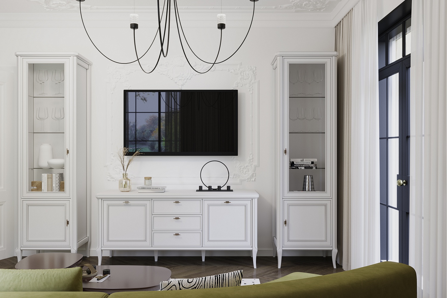 – описание: размер 214.8x287x50.5 см, стиль неоклассика, цвет бело-серый, назначение для гостиной.